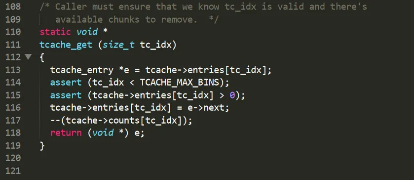 즉 현재 요청한 사이즈가 tcache에 있는 청크로 재할당해줄 수있다는 소리이고, 이때 tcache에서 해당 청크를 가져오는 함수가 바로 tcache_get임