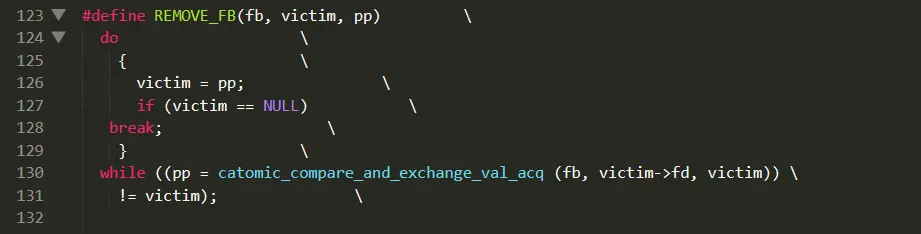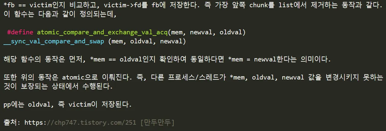 130 라인 > catomic_... 함수의 반환값이 pp에 담기게 되므로 결국 while( pp ≠ victim ) 이라고 보면됨.