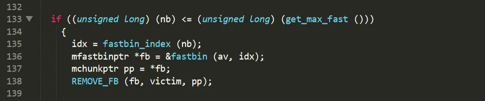 ⇒ #define fastbin(ar_ptr, idx) ((ar_ptr)->fastbinsY[idx])