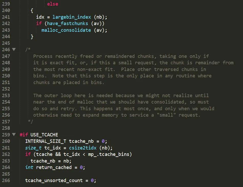 225 라인 > small bin에서 재할당하고 남은 청크들을 tcache_put 함수를 호출하여 tcache에 넣어준다