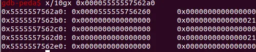 또한 tcache_entry[0] = 0x5555557562a0에 연결된 청크를 보면 0x555555756260 청크가 연결되어 있는 것을 확인할 수 있다.