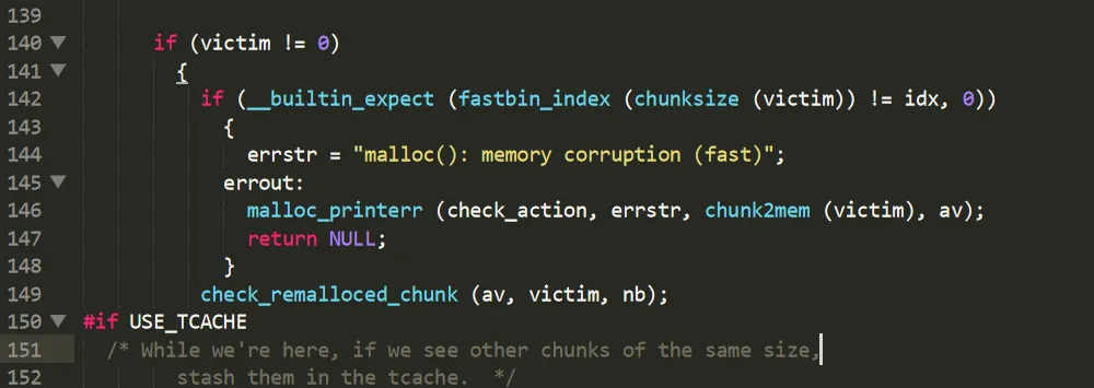 142 라인 > 꺼내온 victim의 청크 사이즈가 실제 그 bin에 맞는 크기인지 검사한다. ** 익스시 fastbin에 등록한 fake chunk의 사이즈를 맞춰줘야하는 이유가 이때문이다