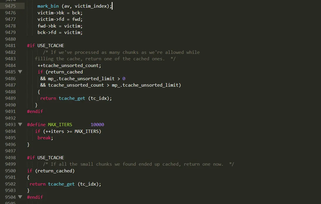 9494 라인 > unsorted bin을 scan하는 과정과 각자의 빈에 넣는 과정을 최대 10000번 반복한다. 여기까지의 과정을 통해 unsorted bin에 있던 모든 청크가 빠져나와 크기에 맞는 bin으로 재분배된다.(사이즈 맞는게 있으면 반환되고)
