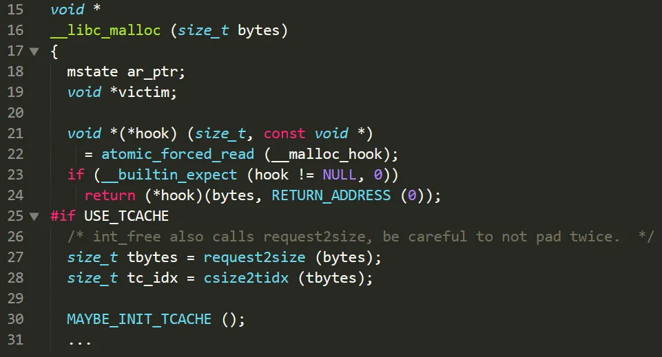 tcache 관련 부분만 보겠다. 나머지는 glibc 2.23 설명했던것과 동일.