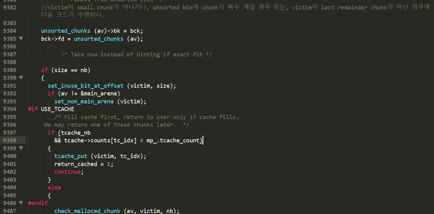 9383라인 윗 부분은 기존 glibc 2.23에서의 동작과 거의 유사함. 위 TCACHE 관련 로직은 unsorted bin에서 처리되는 tcache 관련 부분이다.