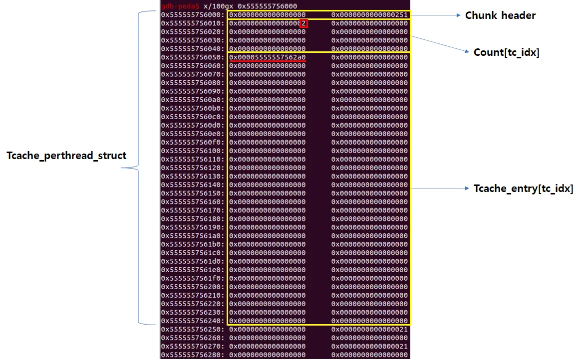 이제 tcache_perthread_strcut 구조체에 어떻게 데이터가 들어가있는지 직접 디버깅으로 확인해보자