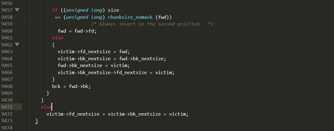 위 코드는 victim이 small chunk가 아니거나, unsorted bin에 청크가 여러개 존재하고, last remainder chunk가 아닐경우 수행되는 로직이다.