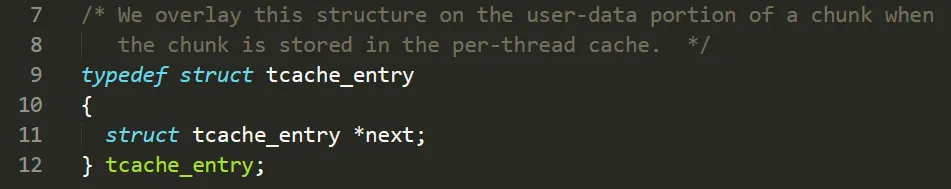 tcache_perthread_struct 구조체에서 두번째 멤버변수인 tcache_entry 또한 구조체 형태로 이루어져있다.