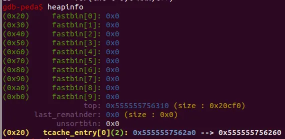 위 그림과 비슷한 상황을 만들었다. 0x20 크기의 청크가 현재 tcache_entry[0] 에 2개의 청크가 리스트로 연결되어 있다.