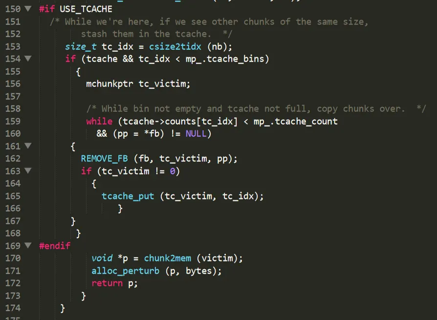 165 라인 > tc_victim이 NULL이 아니라면, tcache_put함수를 호출하여 fastbin에서 뺀 청크를 tache에 삽입한다