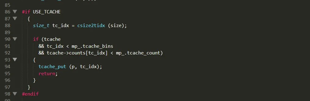 99 라인 > tc_idx 인덱스의 tcache_entry가 NULL이 아니면 tcache_get을 호출함.