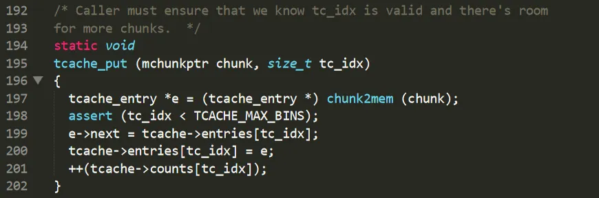 199 ~ 201 라인 > LIFO 구조로 tcache에 삽입한다