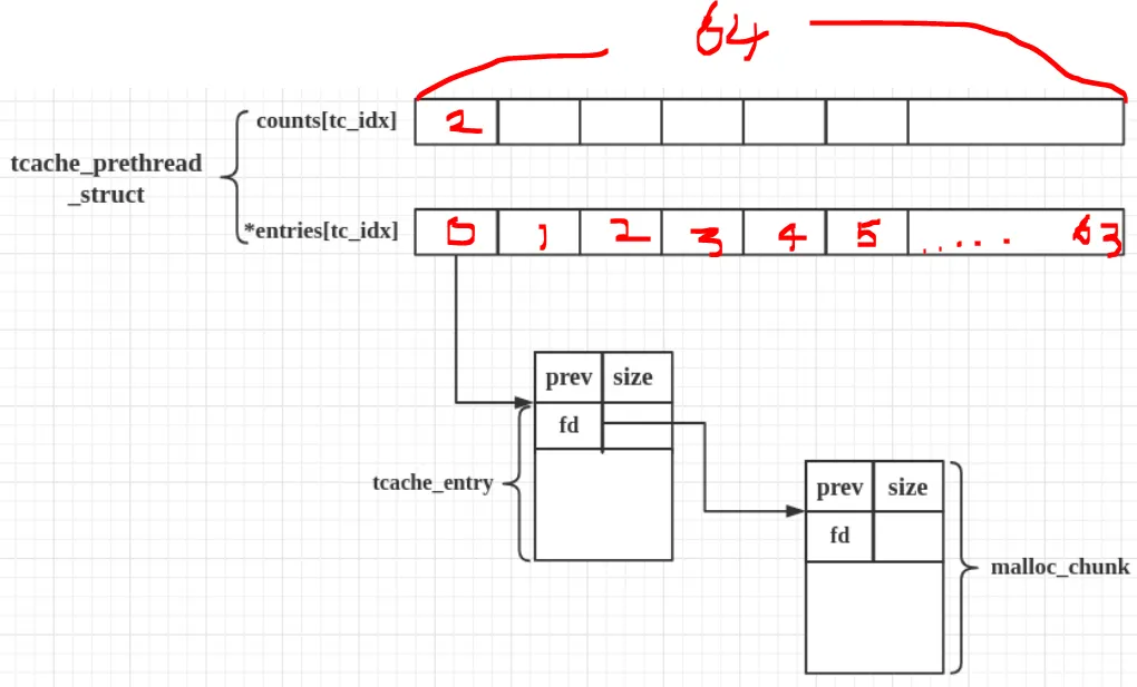 위 사진은 tcache의 전체적인 구조이다. 우선 bin에서 free chunk들이 관리되는 것처럼 tcache에서 free chunk들이 관리된다.