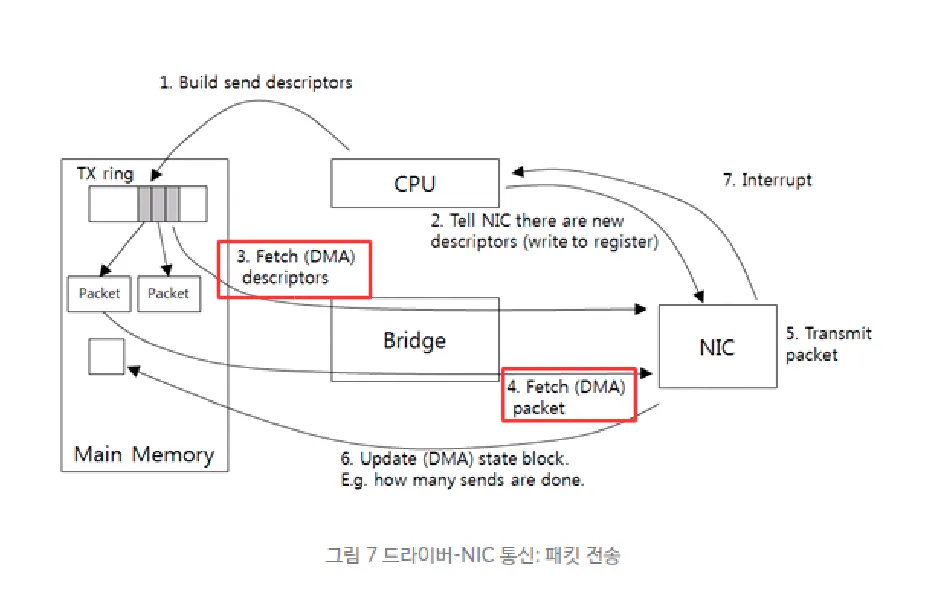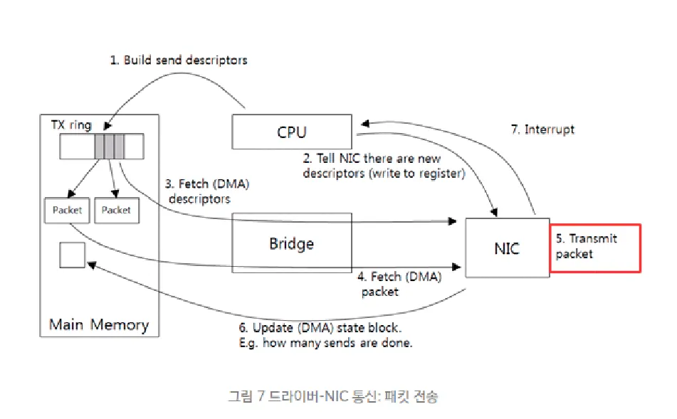 NIC에서 이제 패킷 전송을 위해 Rx-ring 버퍼의 패킷을 가져옴(3)(4)