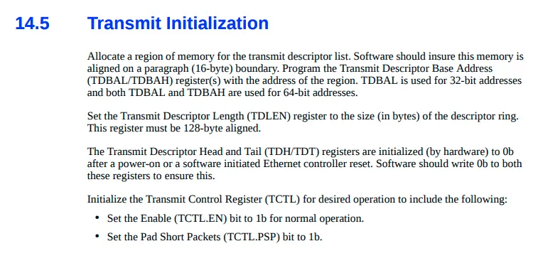 Tx-descriptor, Tx-buffer를 세팅해준다음 TDT 레지스터를 업데이트하여 현재 처리해야할 descriptor가 있다고 알린다.(전에 말한 tx-buffer의 tail에 추가하는 것)