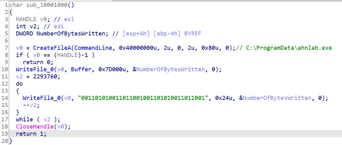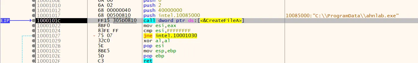 그리고 실제 sub_1001000() 함수 내부에서 복호화한 ahnlab.exe 문자열을 인자로하여 Creatfile을 호출한다. 즉 intel.wll이 WINWORD.EXE 내부에서 로드될 때 ahnlab.exe을 생성한다는 것을 알 수 있따