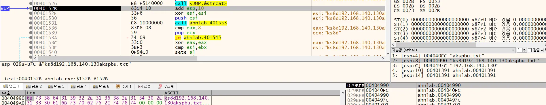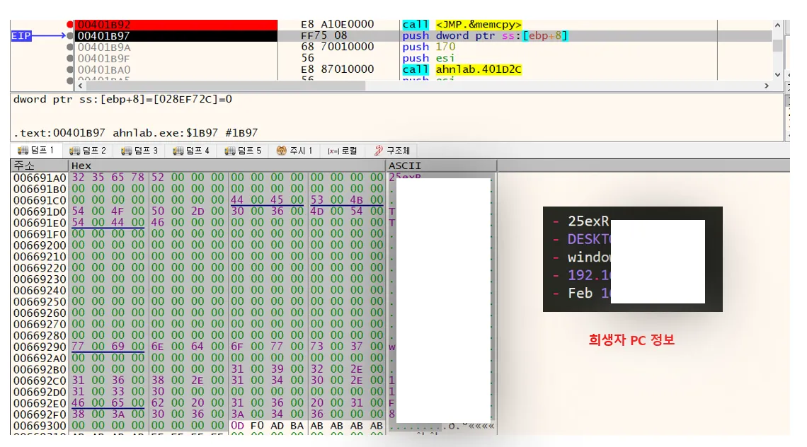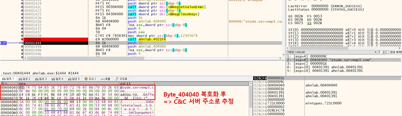 또한 지속 메커니즘을 위해 레지스트리에 생성한 ahnlab.exe 바이너리를 실행시키는 커맨드를 확인 할 수 있다.