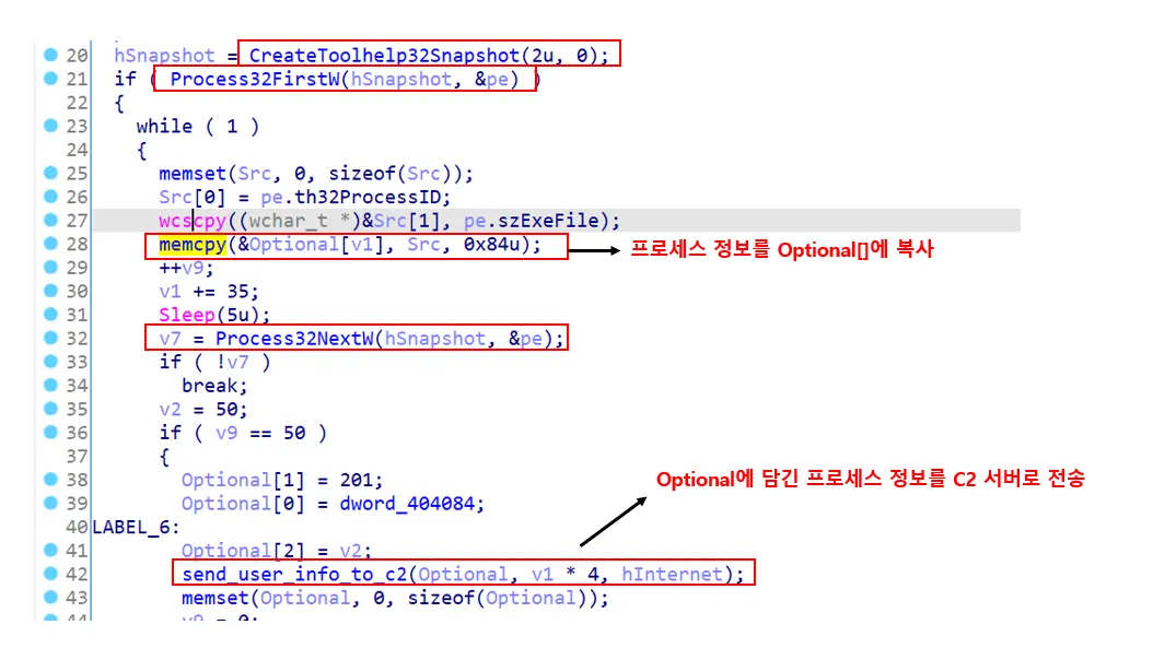 루프를 돌면서 프로세스 정보들을 얻은 뒤, send_user_info_to_c2() 함수로 C2서버에 전송한다