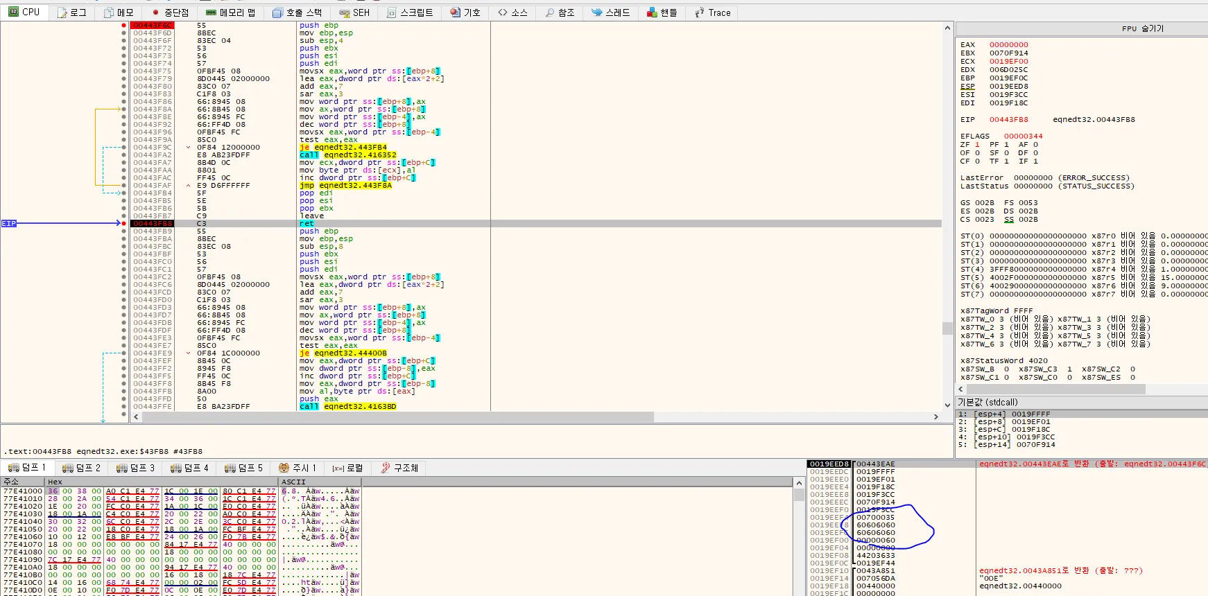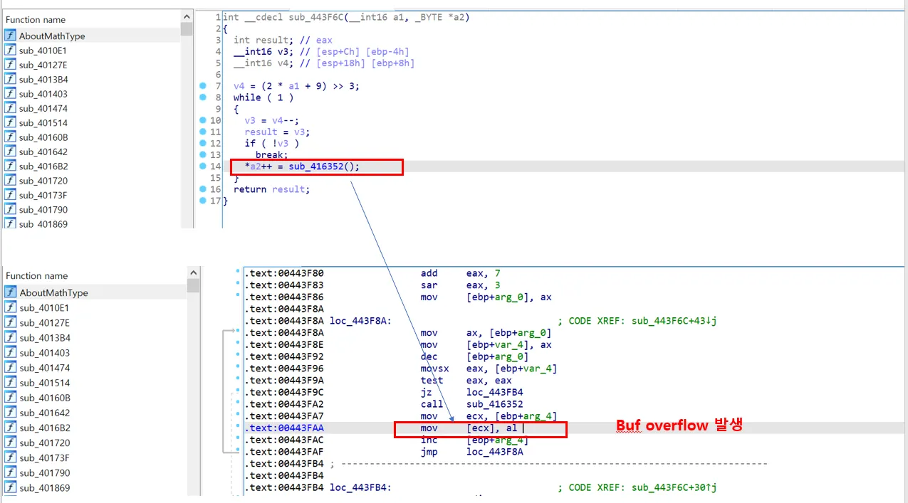 실제 sub_443F6C 함수 내부에서 반복문을 돌면서 " mov [ecx], al " 명령어에 의해 overflow가 발생한다.