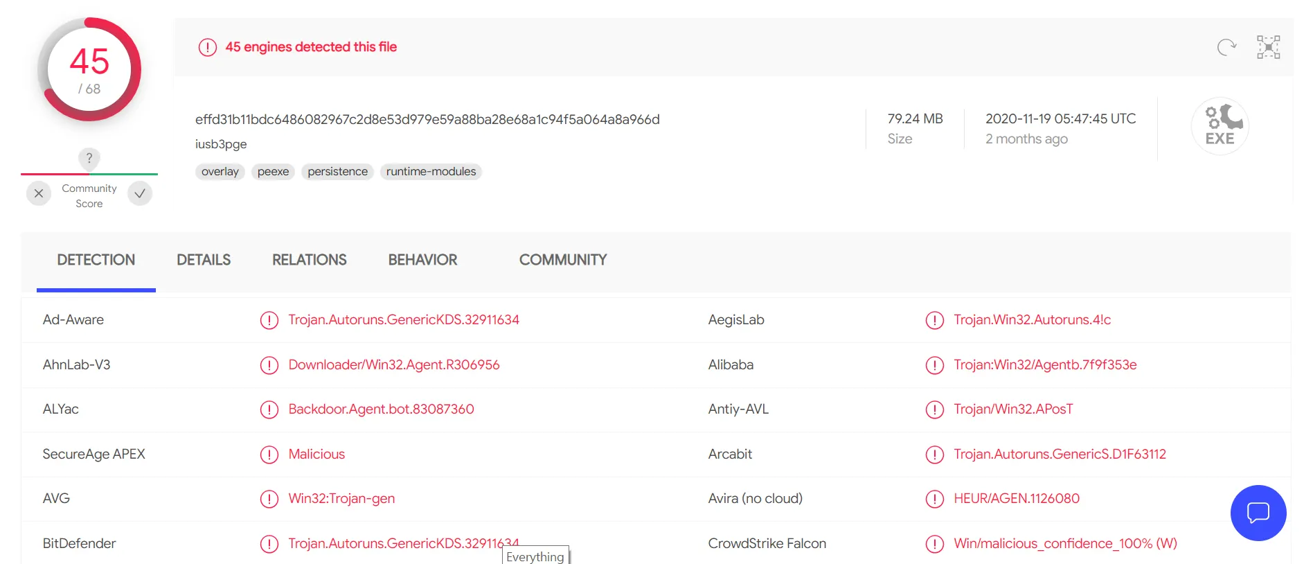 다양한 백신에서 검사된 결과를 확인해보면 다운로드기능, 백도어, 트로이젠 등의 다양한 악성 행위를 한다. 이는 Bisonal malware라는 명칭으로서 공격자의 명령에 따라 다양한 백도어 기능과 시스템 파일 변조 기능을 갖고있다.