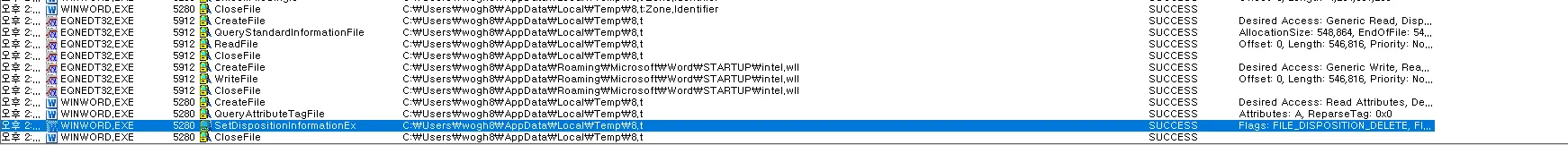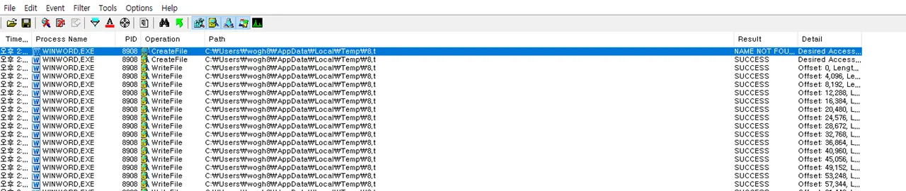 WINWORD.EXE, EQNEDT32.EXE 프로세스를 포함 시킨 뒤, 필터를 걸어서 확인해보면 8.t파일을 생성한 뒤 write 작업을 한다는 것을 볼 수 있다.