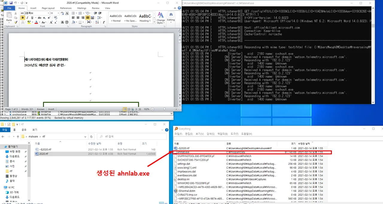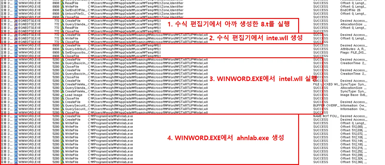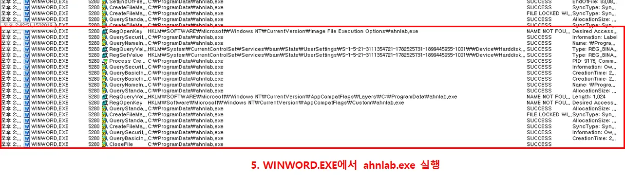 그리고 다시한번 WINWORD.EXE 프로세스가 수행된 후, 하위 프로세스로 ahnlab.exe 가 생성된 것을 확인할 수 있다.