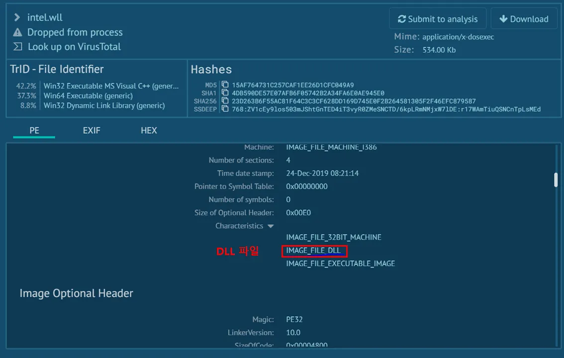 intel.wll 파일의 상세정보를 확인해보면 DLL 파일인것으로 보아 DLL injection 등의 기법으로 삽입되었을 것이다.