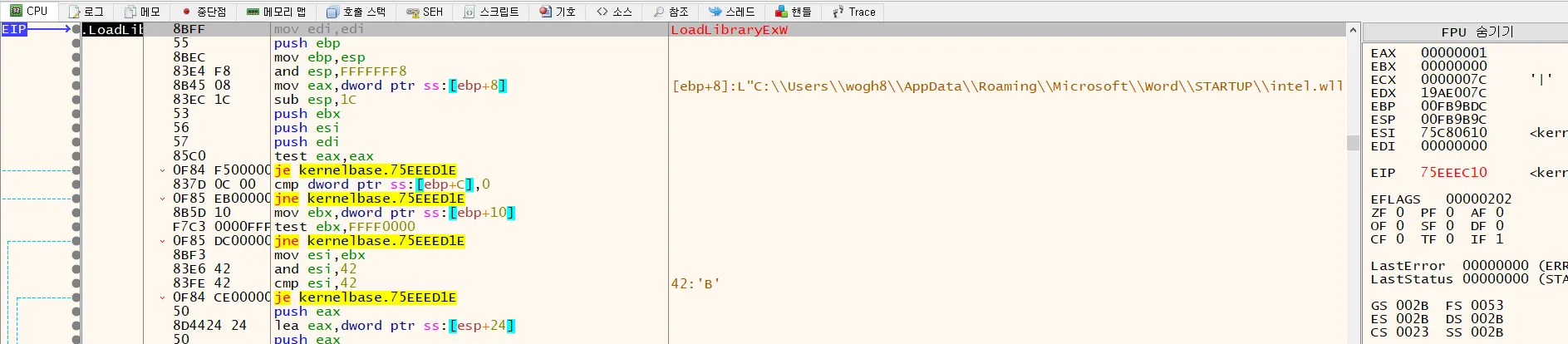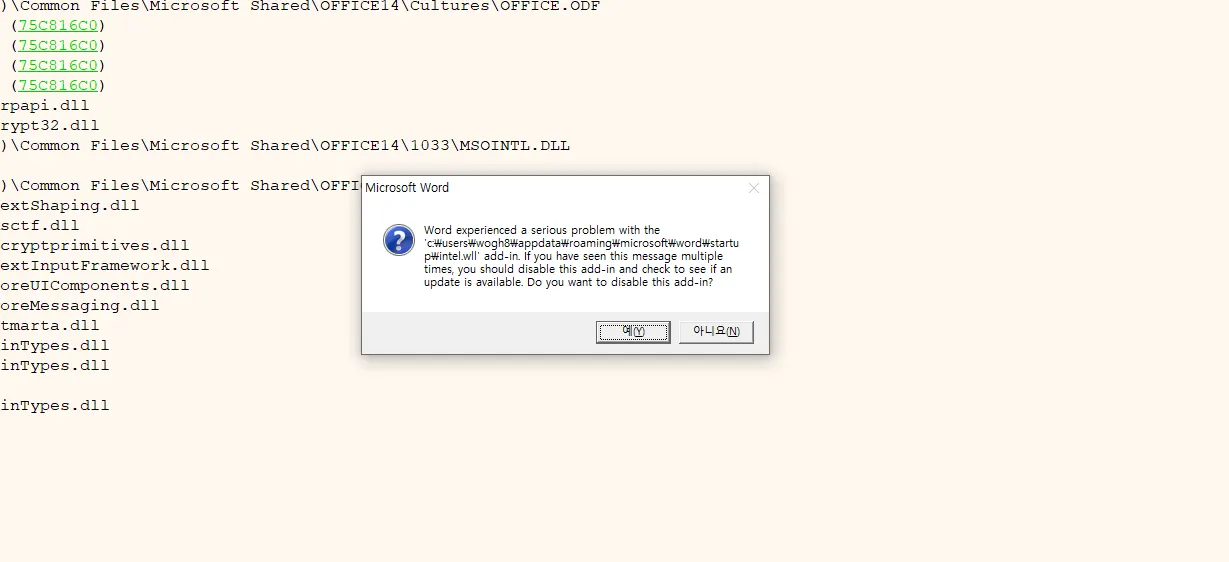 두번째 RTF 문서을 열었을 때 분명 생성한 intel.wll dll 파일을 로드할 것이다. 따라서 LoadLibrary 함수에 bp를 걸고 로드되는 dll들을 하나씩 확인해보다보면 위와 같이 add-in에 심각한 문제가 발생했다고 경고창이 뜬다. 이는 삽입된 intel.wll dll파일로써 아니오를 눌러야 add-in에 추가가 된다.