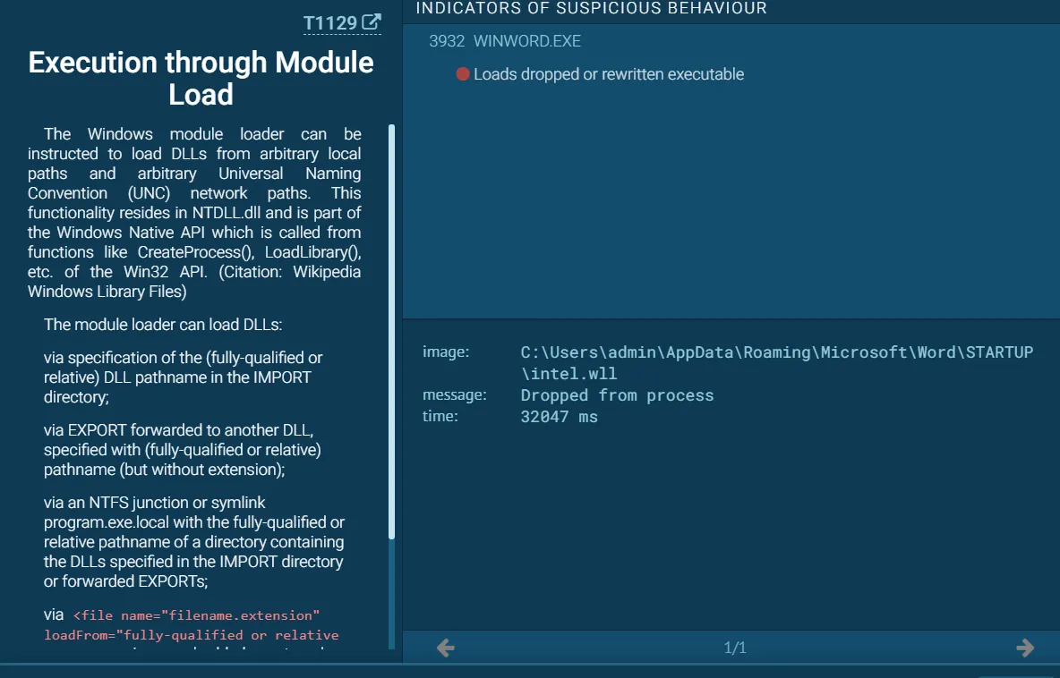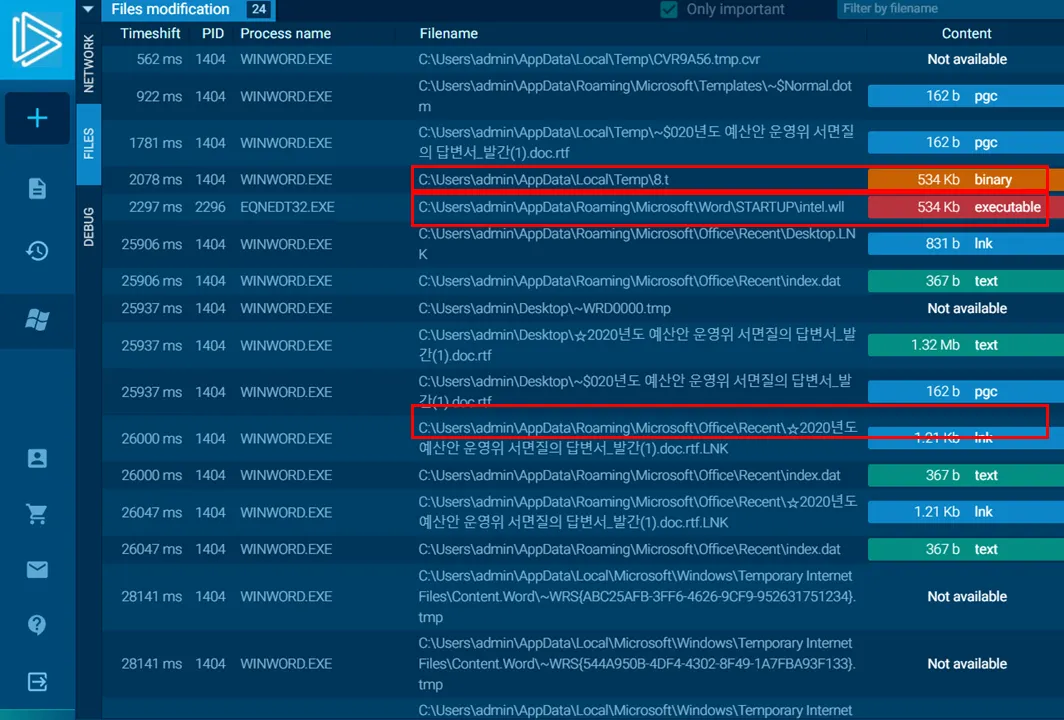 모듈 로드와 관련된 정보를 확인해보면 intel.wll 파일이 startup 폴더에 드랍되었다는걸 다시한번 확인할 수 있다.