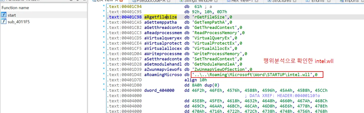 정확한 덤프를 못떠서 그런지 자세한 정보를 얻을 순 없었지만 String을 보면 행위 분석 시에 확인한 intel.wll 이 들어가 있다. 또한 그 위에 여러 API 함수 이름들이 있는데 이를 보아 API 리졸빙 과정을 거처서 원하는 함수 주소를 얻는 것으로 확인된다.