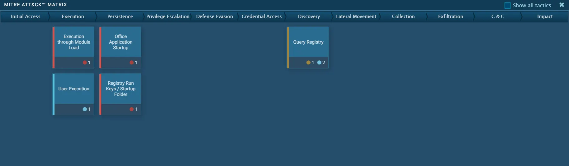 ATT&CK Matrix 정보를 확인하면 다음과 같다. 총 2개 종류의 실행 방식과 2개의 지속 동작 그리고 레지스트리 query 정보를 확인할 수 있다.