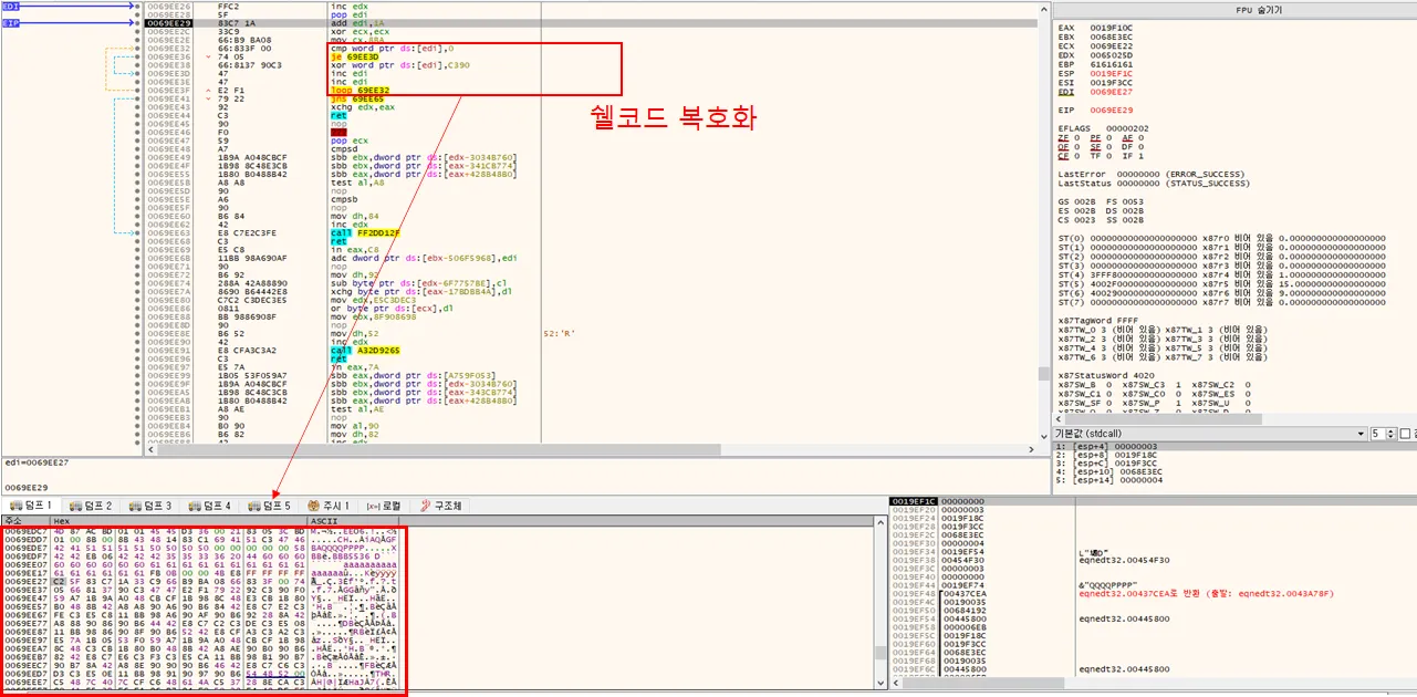 쉘코드를 확인해보면 edi에 들어있는 데이터를 2바이트 씩 루프를 돌면서 xor 연산하는 것을 확인 할 수 있다. xor 키는 0xc390이다. 해당 부분을 덤프를 떠서 확인해보면 다음과 같다