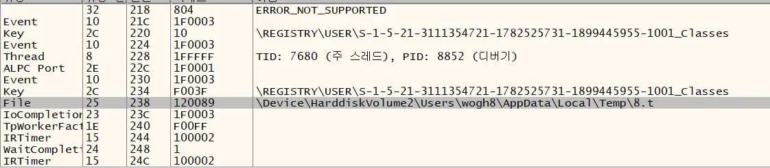 이를 통해 처음 RTF 문서 실행 시 생성되는 8.t 파일의 핸들을 얻은 다음, 가상공간에 할당받는다. 그다음 8.t 파일을 읽어서 메모리에 매핑시킨다. 그 후 intel.wll 파일을 생성한 뒤, writefile 함수를 이용하여 데이터를 쓴다.