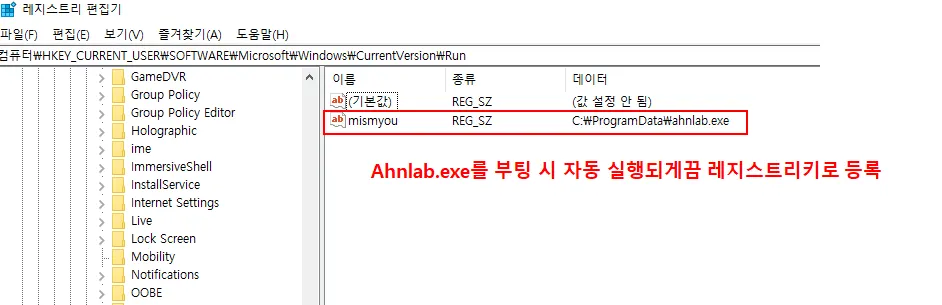그럼 실제 ahnlab.exe가 실행되는 걸 확인 할 수 있고, 샌드박스에서 확인한 것처럼 지속 메커니즘을 적용시키기 위해 레지스트리 키로 등록한다
