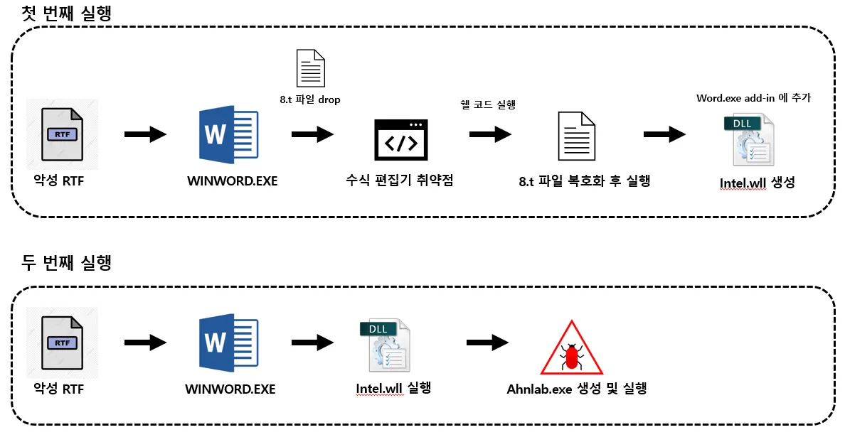 악성 RTF 문서를 실행시키면 8.t 파일이 가장 먼저 생성되고 수식 편집기에 존재하는 취약점을 이용하여 쉘코드(8.t)를 실행시킨다. 해당 쉘코드는 악성 dll(intel.wll) 을 생성하고 이를 winword.exe 프로세스의 add-in에 등록시킨다.