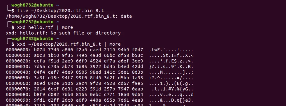 샌드박스에서 확인한 정보를 토대로 실제 RTF 문서 파일 정보를 확인해보면 실제 RTF 문서 포맷인 것을 알 수 있다.
