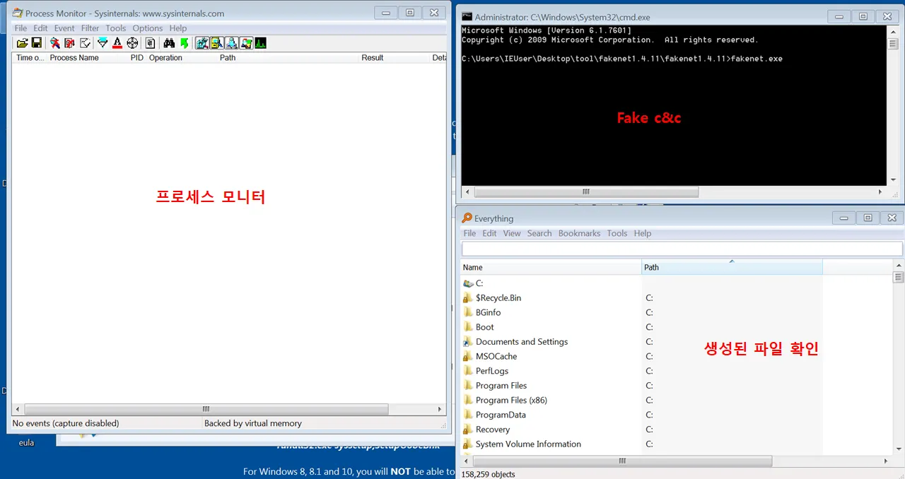 우측 상단이 fakenet 프로그램이며, 우측 하단에서는 생성되는 파일을 확인할 것이다. 마지막으로 좌측 프로세스 모니터를 이용하여 프로세스 일련의 과정을 확인해 볼것이다.