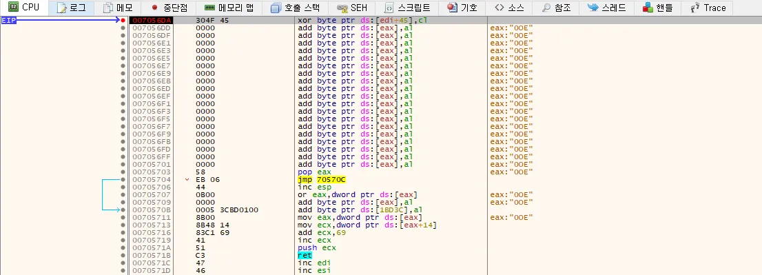 다운 받은 데이터를 기준으로 행해지는 악성 행위가 switch-case 문으로 구분된다. EIP를 강제 이동시켜 각 case 문에서 수행되는 로직을 확인해보자