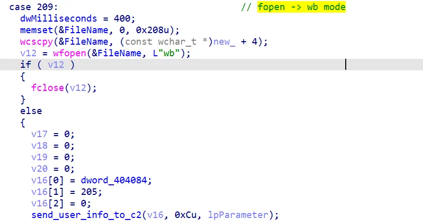 c2 서버로 받은 데이터의 new_+4 에 담긴 값을 FileName으로 복사한다. 해당 파일이름으로 바로 이전에 확인한 case-208에서 파일 생성을 하는 것이다.