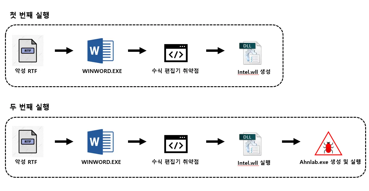 그다음 수식 편집기의 취약점을 이용하여 intel.wll 파일이 생성된다. 다시 RTF 문서를 실행시키면 WINWORD.EXE 프로세스가 실행되면서 다시 수식 편집기의 취약점을 이용하여 intel.wll 파일을 실행시킨다. 해당 dll 내부에서 실제 악성행위를 하는 Ahnlab.exe를 생성 및 실행한다.