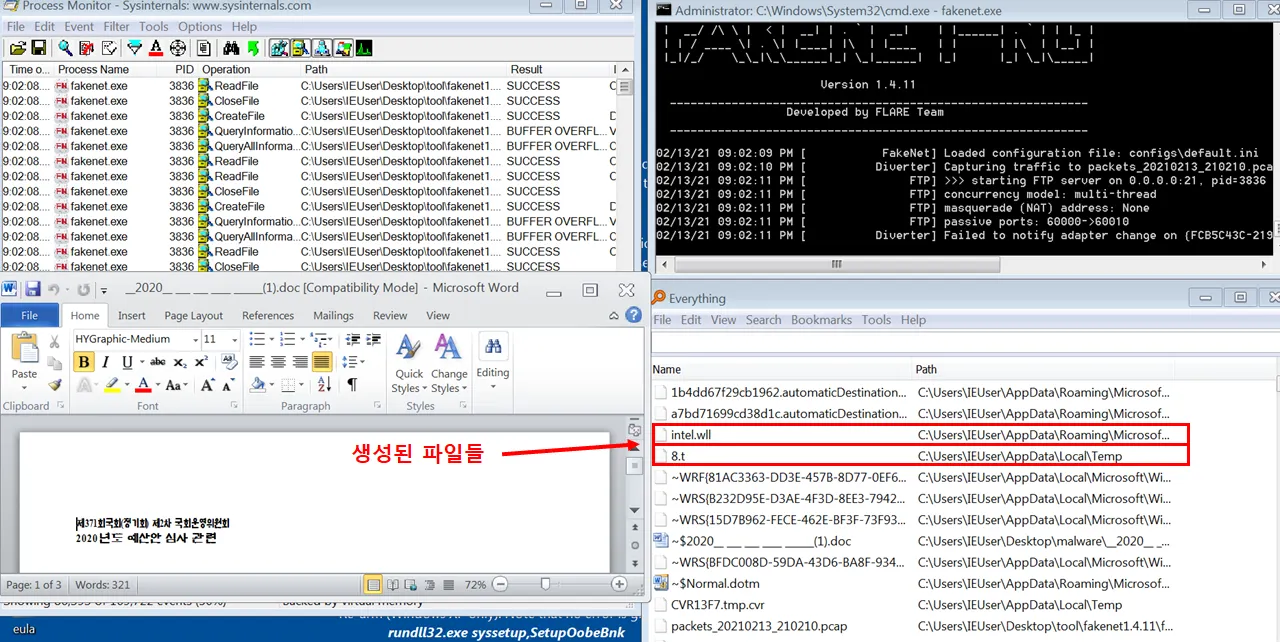 지금까지 첫 RTF 문서가 열리면 생성되는 8.t를 복호화한 뒤 intel.wll 파일이 생성되는 것을 확인했다. 이제 fakenet 프로그램을 실행시킨 뒤 다시 한번 RTF 문서를 열어보자