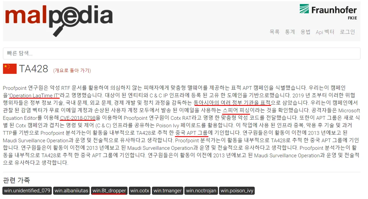 해당 RTF 악성 문서는 중국 APT 그룹에서 제작한 악성코드이며 " Operation LagTime IT " 캠페인 명을 가진다. 또한 동아시아권의 국가들을 타겟으로, 스피어 피싱 메일을 통하여 배포된 것으로 확인된다.
