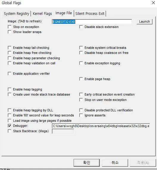window10 SDK의 Gflags 기능을 이용해서 수식 편집기가 실행될 때 디버거를 붙일 것이다.