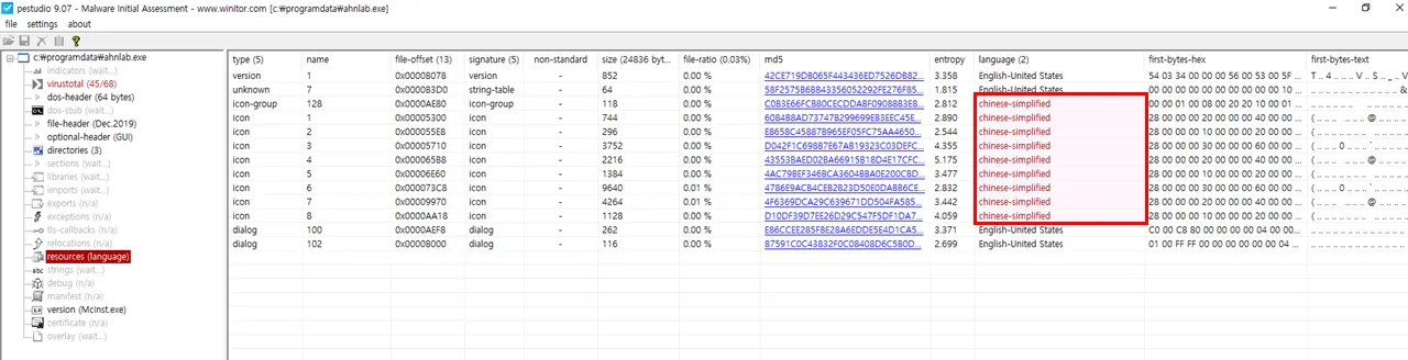 ahnlab.exe 바이너리를 확인해보면 resource 영역에 중국어로 생성되었다는 정황으로 보아 중국해커 가 제작한 악성코드일 가능성이 높다.