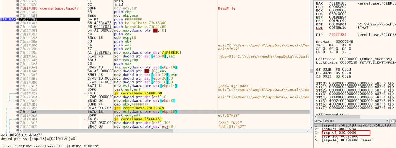 실제 ReadFile 시에 0x30f0000 에 8.t 내용을 넣는다.