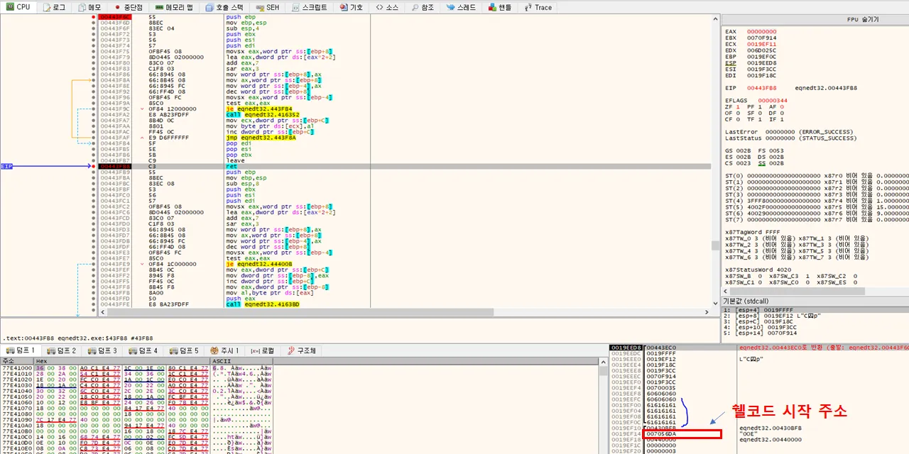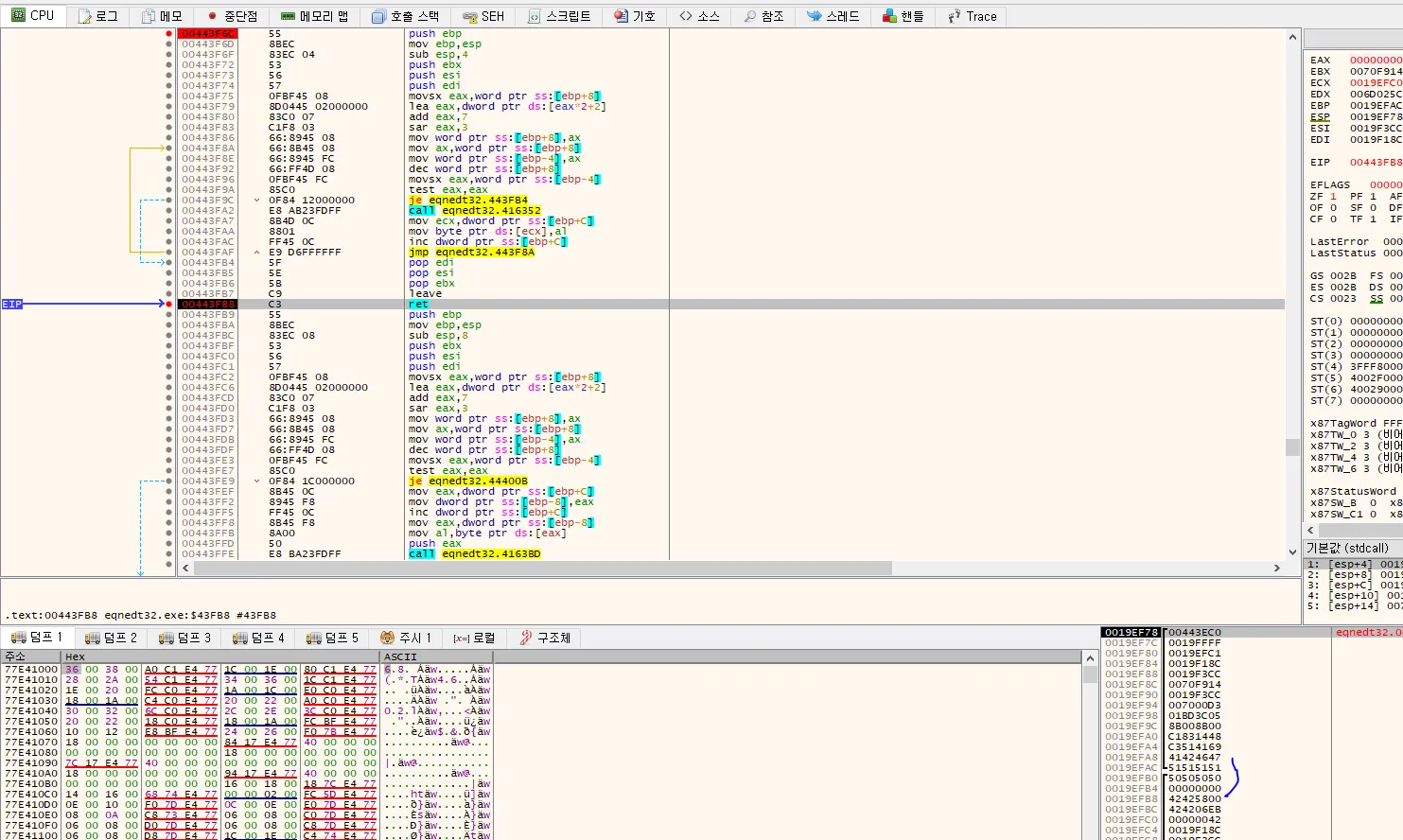 sub_443F6C 에 bp를 걸고 실행하면 다음과 같이 걸린다. 해당 함수가 return되는 위치에 bp를 걸고 stack bof를 확인해보자.