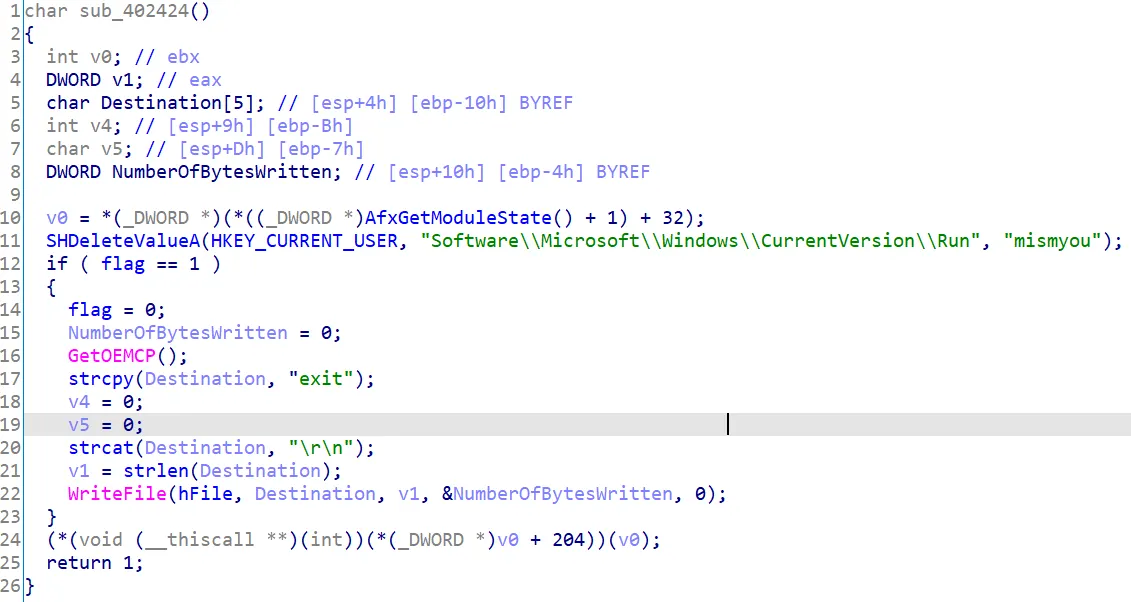 sub_402424()//등록한 레지스트리 키 mismyou 삭제
