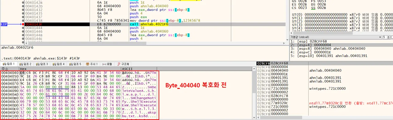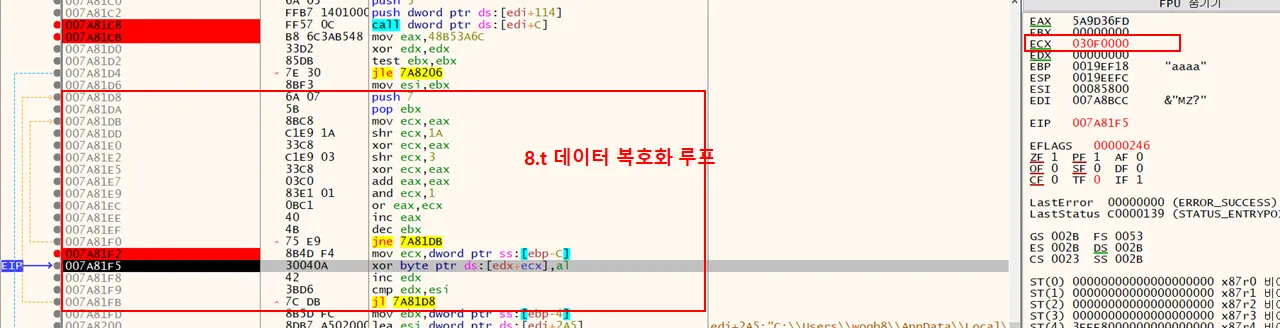 이제 할당받은 영역에 복사한 8.t 데이터를 복호화 하는 과정을 거친다
