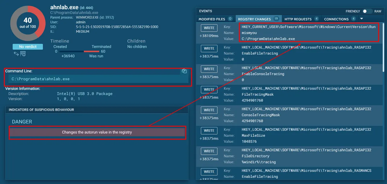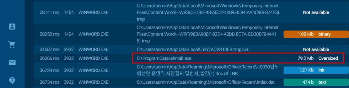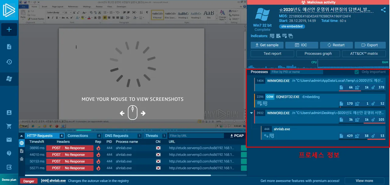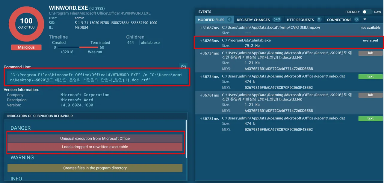 두번째 실행된 WINWORD.EXE의 정보이다. Unusual한 실행을 한다고 분석되어 있으며 자식 프로세스로 ahnlab.exe 를 생성한다