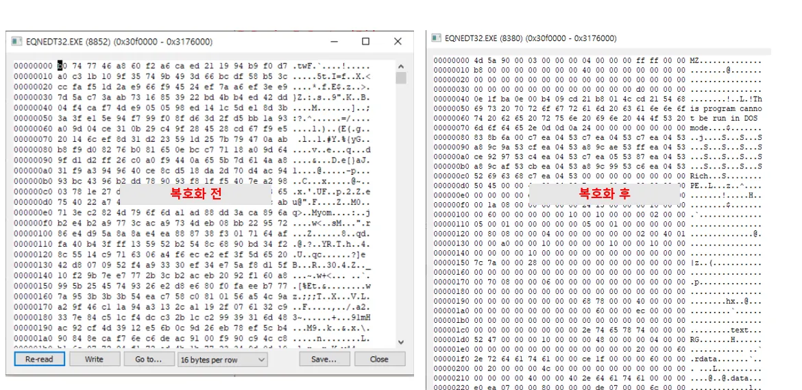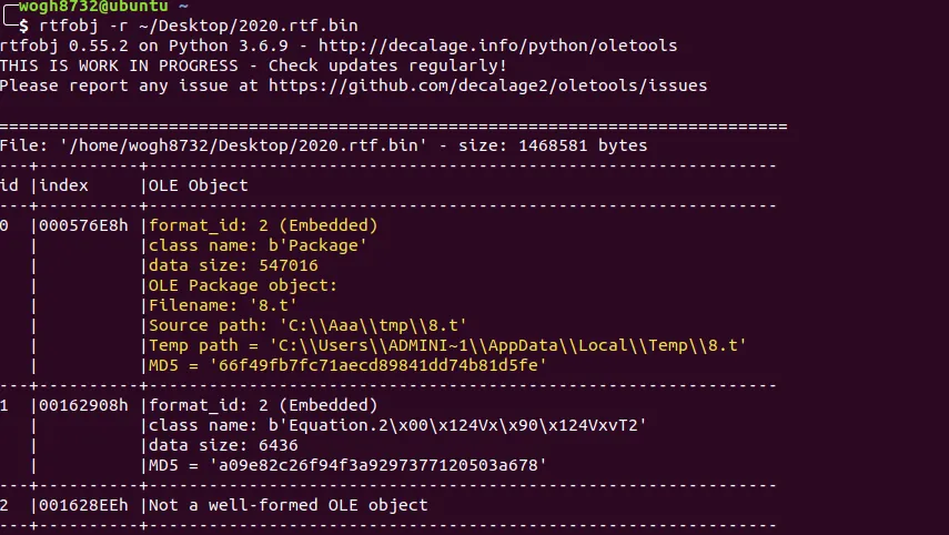 RTF 문서 내부에서 수식 편집기 기능을 이용하여 쉘코드가 삽입되므로, 해당 문서 내부에서 수식편집 기능에 사용되는 OLE 객체 정보를 확인해보면 2개의 OLE 객체를 확인할 수 있다.